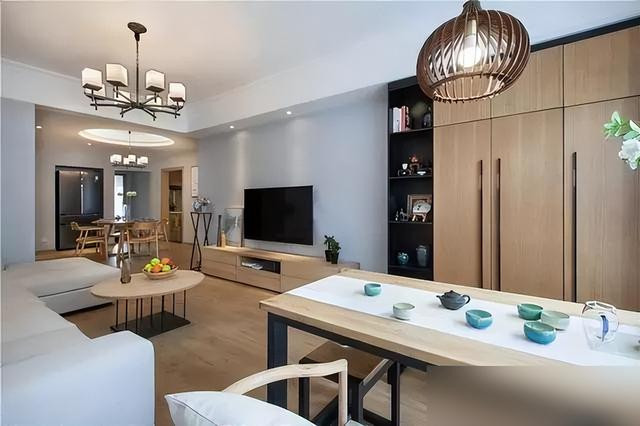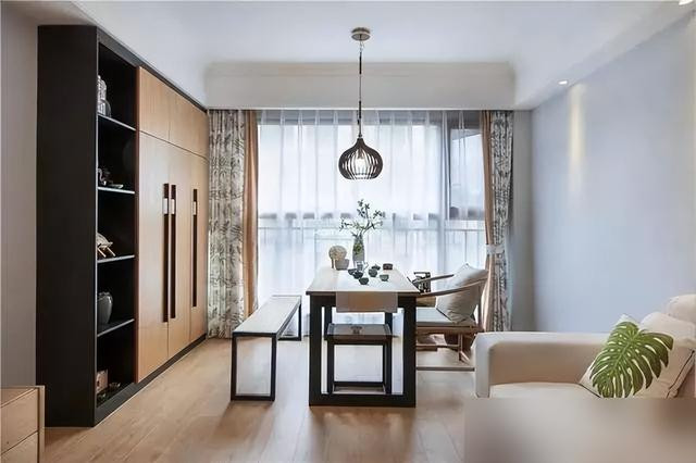 茶室木柜既是储物担当又是展示架,餐边柜藏着生活琐碎却用弧形门板弱化厚重感。
