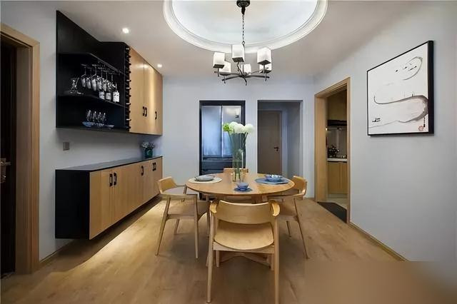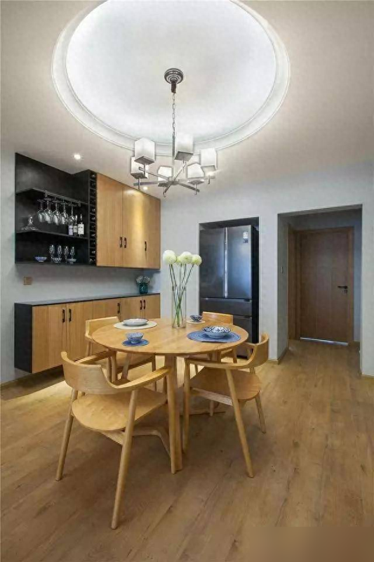 餐边柜做成上下分体也机智,上层玻璃柜存茶叶酒杯,下层带门柜囤米面粮油,圆桌配上环形吊灯,吃饭都吃出团圆氛围。