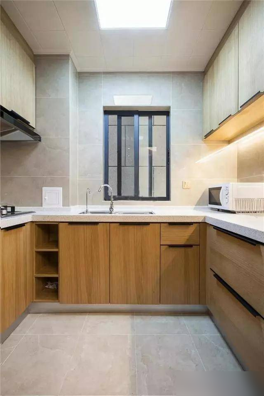 这种设计对经常下厨的人太友好了——台面宽敞得能摆开三四个菜板,碗碟收进底柜抬手就能够着。